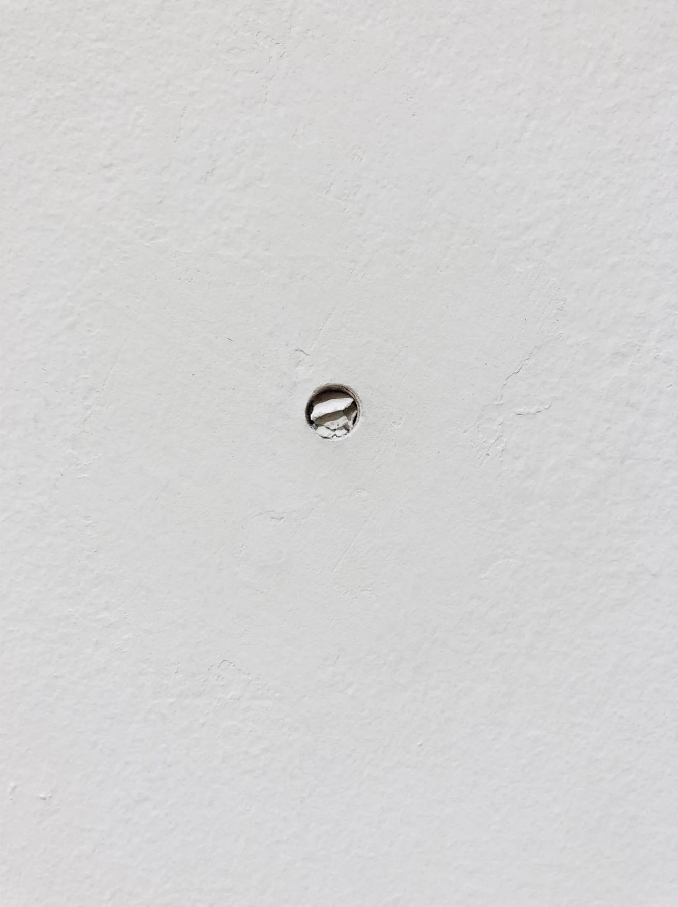 Hole in the wall filled with plaster from a drilled opening in the wall of the San Fernando